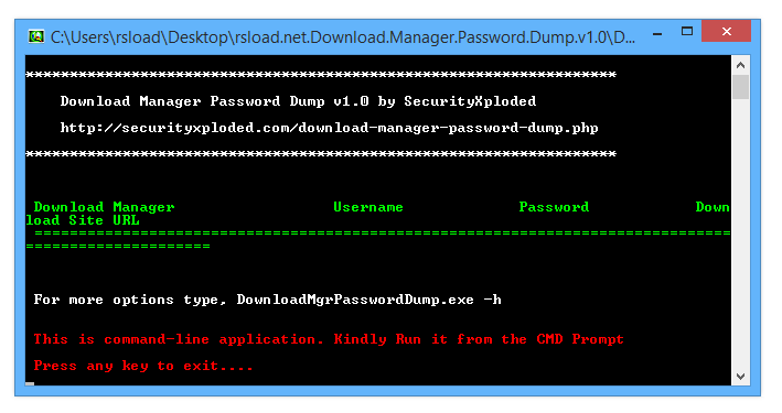 Download Manager Password Dump v1.0 – это утилита с консольным интерфейсом, предназначенная для восстановления паролей, сохранённых в популярных менеджерах загрузки. Программа автоматически определяет установленные клиенты, извлекает данные из их профилей и отображает логины с паролями. Поддерживается работа с такими приложениями, как Internet Download Manager, JDownloader, Free Download Manager и другими.