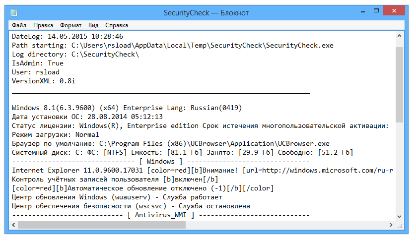Security Check разработана для оперативного анализа системы с целью обнаружения потенциальных угроз, связанных с устаревшим программным обеспечением. Утилита работает без установки и запускается только с правами администратора, что обеспечивает полный доступ к системным параметрам. Проверка охватывает множество аспектов, включая состояние контроля учетных записей, наличие установленных сервис паков, версию Internet Explorer, уровень обновлений операционной системы, а также конфигурацию антивирусов и файерволов. Особое внимание уделяется актуальности Java, которая часто становится объектом эксплуатации уязвимостей. После завершения анализа результаты сохраняются в лог-файл, который можно открыть в блокноте или в виде HTML-страницы, если запустить утилиту с параметром -! /htmllog.