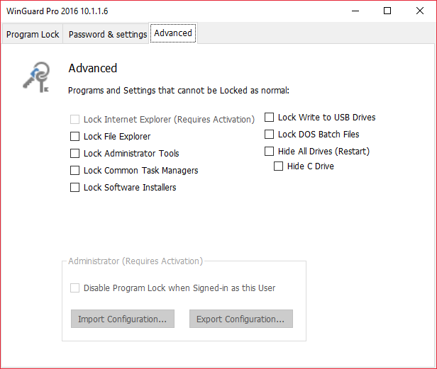 WinGuard 2016 Pro 10.0.3.2 и 10.1.1.61 — это компактное программное решение для защиты приложений, файлов и системных функций с помощью пароля. Программа позволяет эффективно ограничить доступ к конфиденциальным данным, скрыть логические диски, заблокировать запуск сторонних приложений и управлять правами пользователя. Несмотря на отсутствие официальной поддержки русского языка, интерфейс интуитивно понятен и не требует глубоких знаний для настройки.