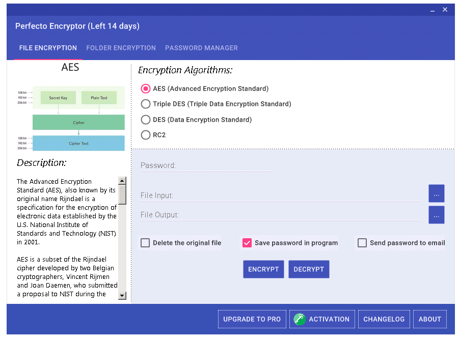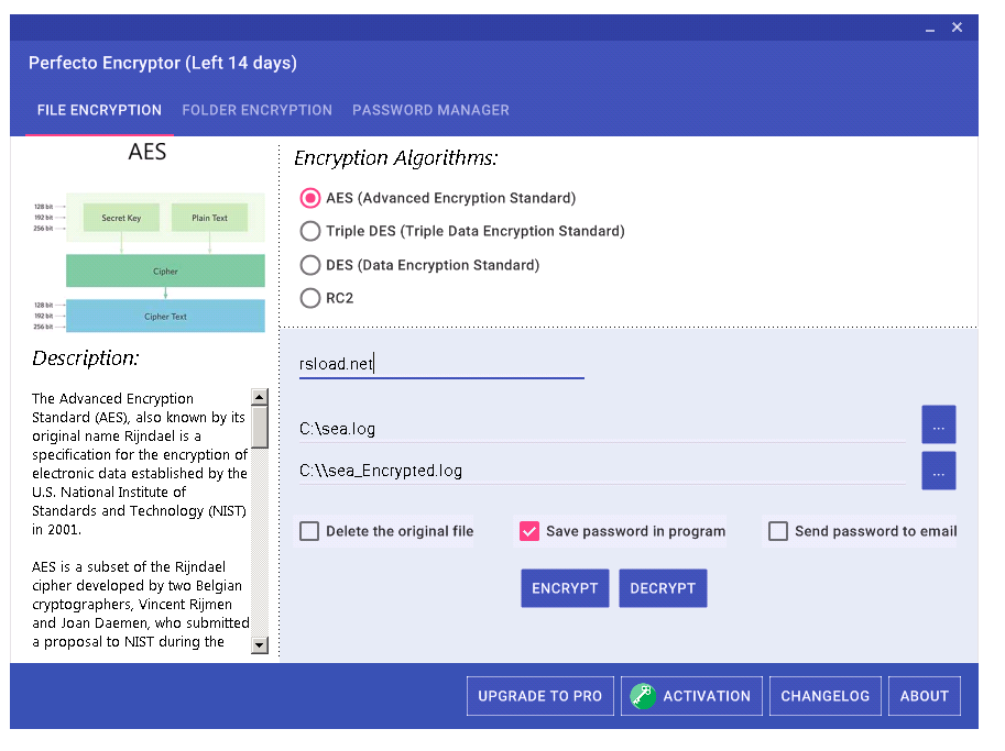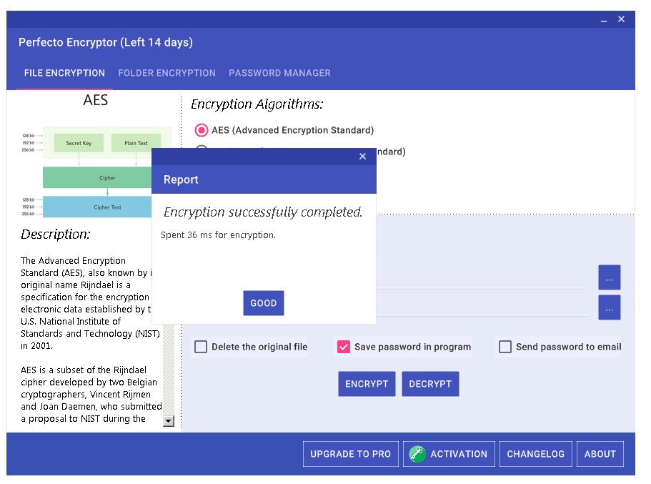 Использование Black Bird Perfecto Encryptor Pro не вызывает сложностей благодаря продуманной архитектуре интерфейса. Для начала работы нужно выбрать файл или каталог, щелкнув по соответствующей кнопке в главном окне. Далее пользователь указывает желаемый алгоритм шифрования, из представленных четырех вариантов, после чего задается надежный пароль. Программа предупреждает о важности запоминания пароля, поскольку его утеря сделает расшифровку невозможной. После подтверждения запускается процесс, который занимает несколько секунд в зависимости от объема данных. По завершении файл становится недоступным без ввода пароля, а при попытке открытия появляется запрос на его ввод. Расшифровка выполняется в аналогичном порядке — с выбором объекта и вводом корректного пароля.