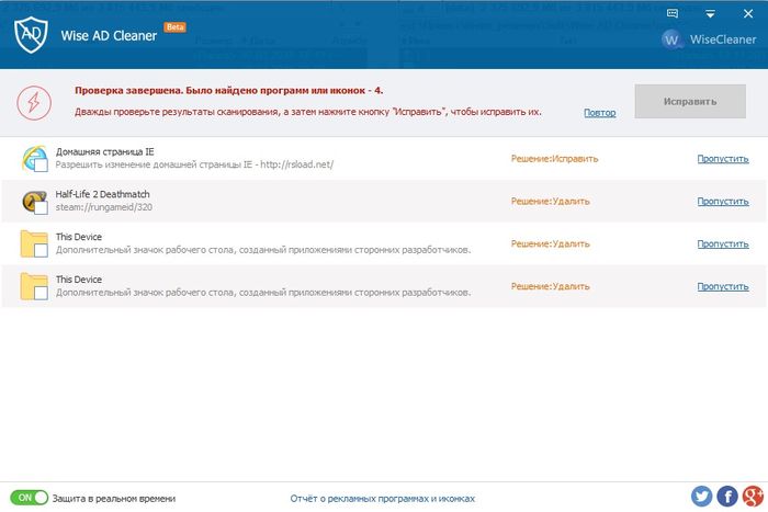 - Обнаруживает и блокирует AdWare в режиме реального времени