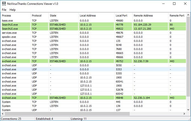 NoVirusThanks Connections Viewer 1.1 — это легковесная и бесплатная утилита для отслеживания активных сетевых соединений на компьютере под управлением Windows. Программа предоставляет детальную информацию о текущих подключениях, включая тип протокола, локальные и удалённые адреса, порты и процессы, задействованные в обмене данными. Её простой интерфейс и функциональность позволяют быстро идентифицировать подозрительные соединения и контролировать сетевую активность системы.