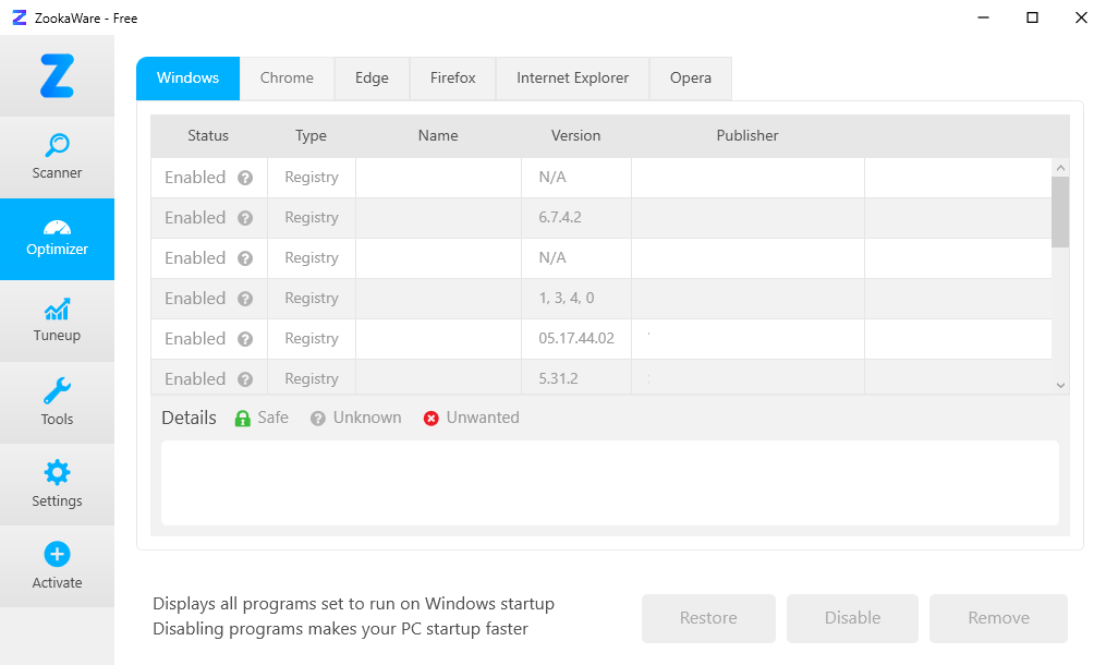 Интерфейс ZookaWare Pro интуитивно понятен и не требует технических знаний для эффективного использования. После запуска приложение проводит полное сканирование системы, выделяя все подозрительные и ненужные объекты. Пользователь получает полный контроль над процессом удаления, поскольку может выбирать, какие элементы очищать, а какие оставить или временно отключить. Вкладка «Оптимизатор» позволяет просматривать список программ автозагрузки, записей реестра и плагинов браузеров. Каждый найденный компонент можно анализировать индивидуально, принимая осознанное решение о его судьбе. Это снижает риск случайного удаления важных системных файлов. Кроме того, в случае ошибки всегда есть возможность восстановить удалённые данные через соответствующий раздел программы.