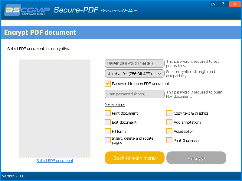 Secure-PDF Professional 2.013 представляет собой инструмент для повышения безопасности PDF-файлов, позволяющий использовать современные алгоритмы шифрования. Программа поддерживает шифрование по стандарту AES с длиной ключа до 256 бит, что обеспечивает высокий уровень защиты от несанкционированного доступа. Пользователь может установить пароль на открытие документа, а также задать дополнительные ограничения: запрет на редактирование, копирование текста, печать, заполнение форм и изменение структуры документа.