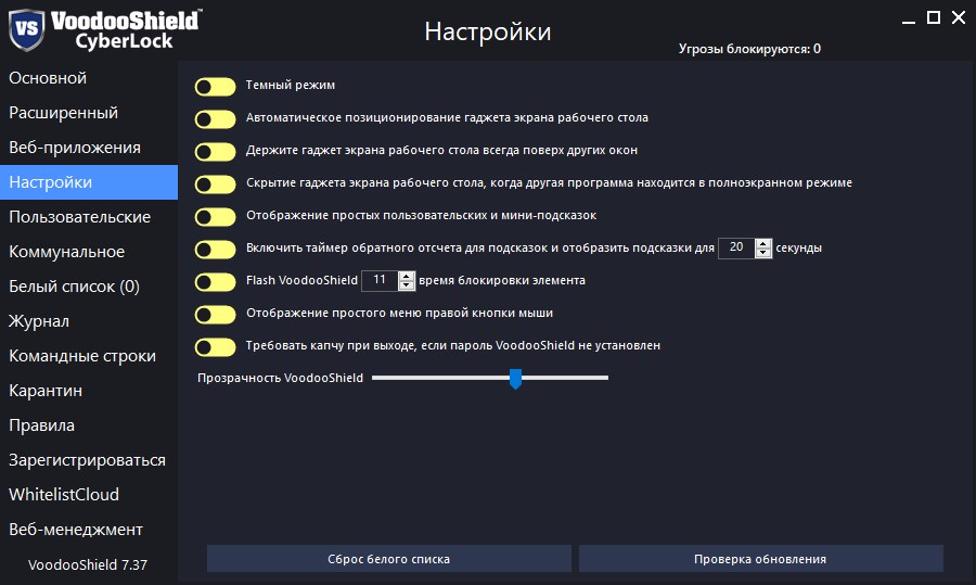 - Voodooshield использует уникальную систему защиты, основанную на whitelist-подходе, что исключает запуск непроверенного ПО.