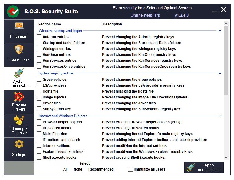 Освоение интерфейса SOS Security Suite происходит быстро, несмотря на сдержанную и строгую стилистику оформления. Пользователь может перейти в раздел System Immunization and Execute для настройки защиты от запуска потенциально опасных приложений. Добавление программ в белый список позволяет избежать ложных срабатываний и обеспечивает удобное управление разрешёнными процессами. Модуль обнаружения недостатков системы проводит анализ текущего состояния Windows, указывая на уязвимости, ошибки реестра и проблемы с драйверами.