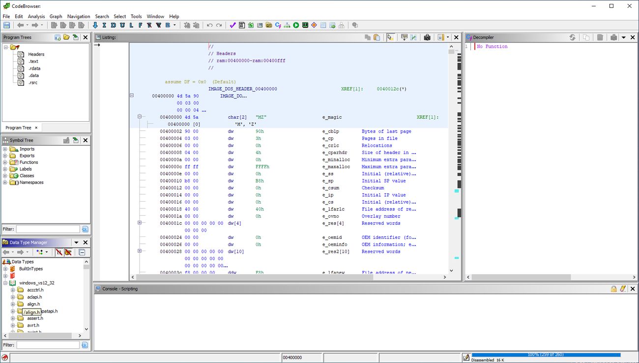 Интерфейс Ghidra 11.4.2 построен по модульному принципу, что обеспечивает гибкость при работе с различными типами задач. После загрузки исполняемого файла система автоматически начинает анализ, определяя функции, строки, вызовы API и структуру кода. Пользователь может переключаться между дизассемблированным представлением и декомпилированным кодом высокого уровня, что помогает быстрее понять алгоритмы, реализованные в программе. Браузер кода позволяет навигацию по символам, ссылкам и кросс-референсам, а встроенная система поиска ускоряет выявление подозрительных участков.