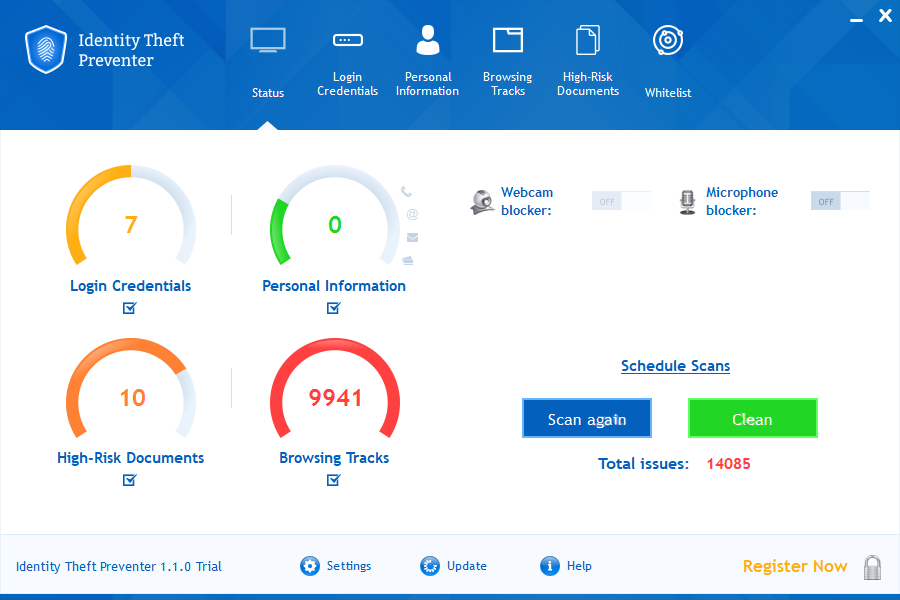 Identity Theft Preventer разработан как инструмент комплексной защиты личной информации от несанкционированного доступа. Программное обеспечение проводит детальное сканирование жесткого диска, анализируя хранящиеся учетные данные, файлы cookie, историю посещений и рискованные документы, которые могут содержать конфиденциальные данные. Интерфейс приложения интуитивно понятен, все функции организованы в виде вкладок, доступ к которым осуществляется через верхнюю панель управления.