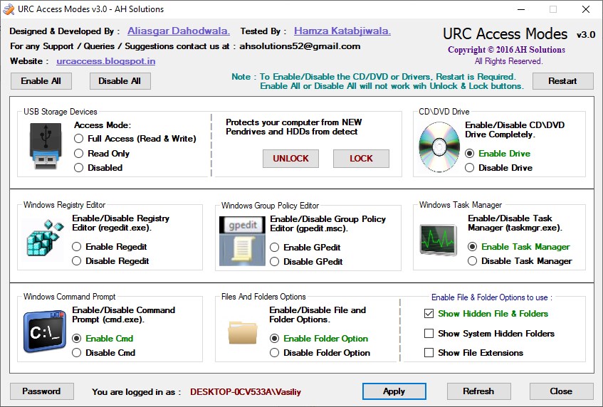 URC Access Modes 3.0 разработана компанией AHSOLUTIONS как инструмент для обеспечения безопасности персональных данных на устройствах под управлением Windows. Утилита даёт полный контроль над подключением USB-носителей, таких как флешки и внешние жёсткие диски, а также над использованием CD и DVD-приводов. Это особенно полезно в условиях ограниченного доступа к информации, например, в учебных заведениях, офисах или на общих компьютерах. Защита редактируется быстро, без необходимости углубляться в настройки операционной системы.