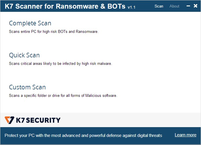 K7 Scanner for Ransomware & BOTs 1.0.0.721 разработан как дополнительный инструмент к существующей системе защиты. Он ориентирован на выявление целевых угроз, включая шпионское ПО, ботов и программы-вымогатели. Благодаря компактному размеру и отсутствию необходимости в установке, его можно использовать с переносного носителя, что особенно полезно при анализе заражённых систем.
