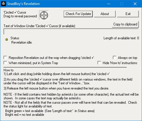 Использование SnadBoy’s Revelation предельно просто. После запуска приложения на экране появляется небольшое окно с иконкой в виде мишени. Для расшифровки пароля нужно зажать левую кнопку мыши и перетащить этот значок на нужное текстовое поле, где вместо символов отображаются звёздочки. В момент наведения программа считывает содержимое поля и показывает настоящий пароль. Результат отображается в диалоговом окне, где также доступны справка и проверка обновлений. Интерфейс интуитивно понятен и не требует специальных навыков. Для раскрытия нескольких паролей можно повторять операцию столько раз, сколько необходимо.