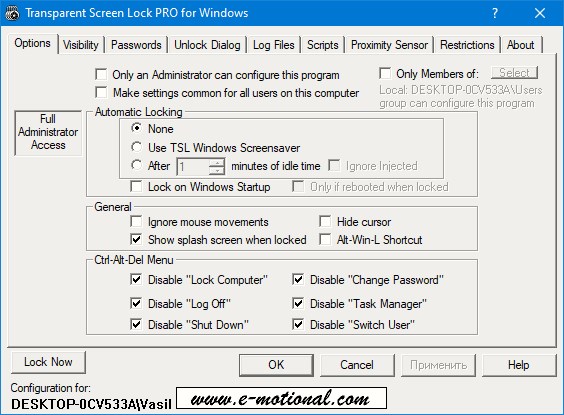 Программа настраивается через интуитивно понятное меню, где можно активировать автоматическую блокировку после заданного времени бездействия. Доступно ручное управление с помощью горячих клавиш или системного трея. Пользователь выбирает тип блокировки — прозрачный, затемнённый или пустой экран, а также может удалить иконки рабочего стола и скрыть панель задач. Настройки безопасности включают фильтрацию доступа по группам, отключение опасных комбинаций и активацию датчика приближения при использовании с ноутбуком или планшетом. Поддержка RDP и терминальных серверов позволяет использовать программу в сети.