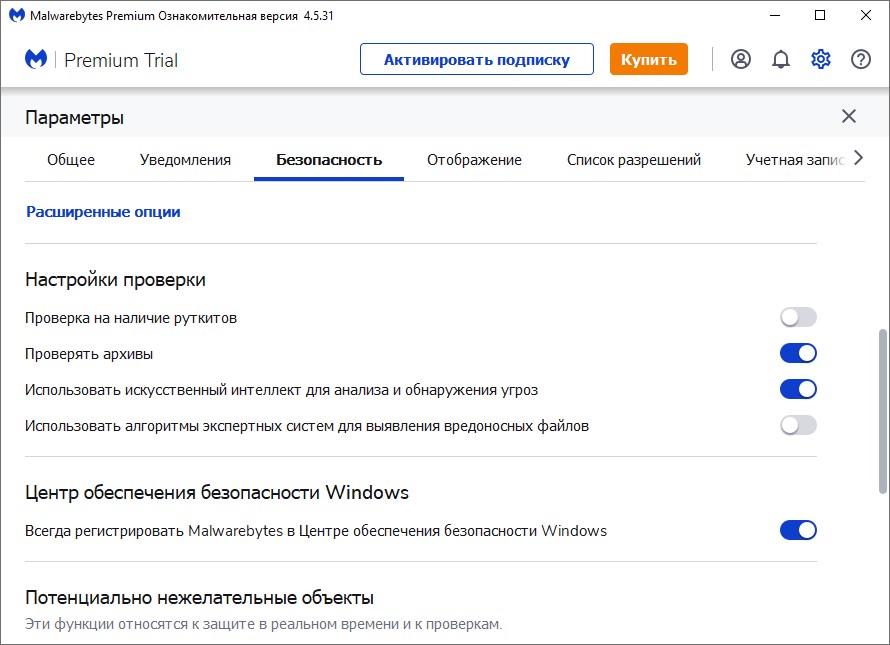 Работа с Malwarebytes Premium