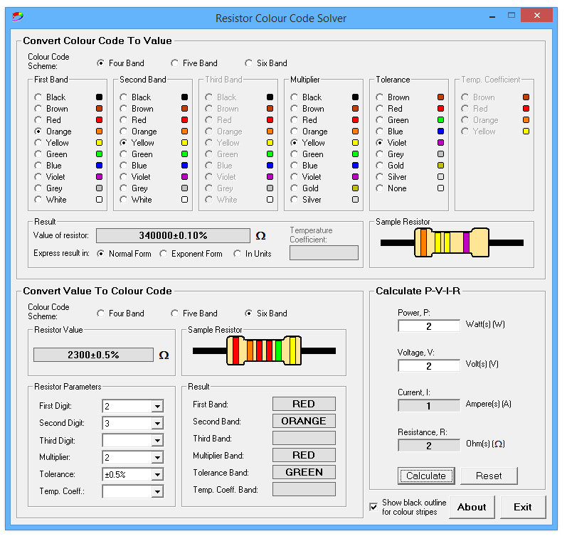 Пользоваться программой предельно просто. При запуске пользователь видит графическую модель резистора с полосами, каждую из которых можно щёлкнуть мышью, чтобы выбрать нужный цвет. В выпадающем списке представлены все стандартные цвета, соответствующие значениям из международной системы обозначений. После выбора всех полос программа автоматически отображает номинал сопротивления, а также диапазон допуска. Также доступна функция ввода числового значения — программа подскажет, какие цвета будут соответствовать заданному сопротивлению. Это удобно при подборе резисторов для схем. Кроме того, встроенный P-V-I-R калькулятор позволяет рассчитывать электрические параметры цепи, используя известные значения мощности, напряжения, тока или сопротивления.
