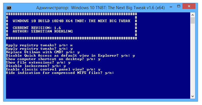 Использование утилиты предельно простое: необходимо запустить исполняемый .cmd-файл с правами администратора. После запуска в консоли появляется пошаговое меню, где пользователю предлагается ввести Y (да) или N (нет) для каждого пункта настройки. Каждое действие сопровождается кратким описанием, что позволяет понять, какой эффект окажет выбор. Русифицированная версия Windows 10 TNBT v17, созданная ZDW, делает процесс доступным и для пользователей, не владеющих английским языком. Все изменения применяются немедленно после подтверждения, а скрипт может быть запущен повторно для корректировки настроек.