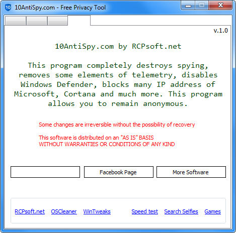 10AntiSpy разработана для пользователей, стремящихся повысить уровень конфиденциальности при работе с Windows 10. Утилита направлена на отключение встроенных механизмов сбора данных, включая телеметрию, диагностику и рекламные службы. Размер дистрибутива составляет всего 186 КБ, что делает её одной из самых легковесных в своём классе. Программа распространяется бесплатно и не требует установки — она портативна и готова к использованию сразу после запуска.