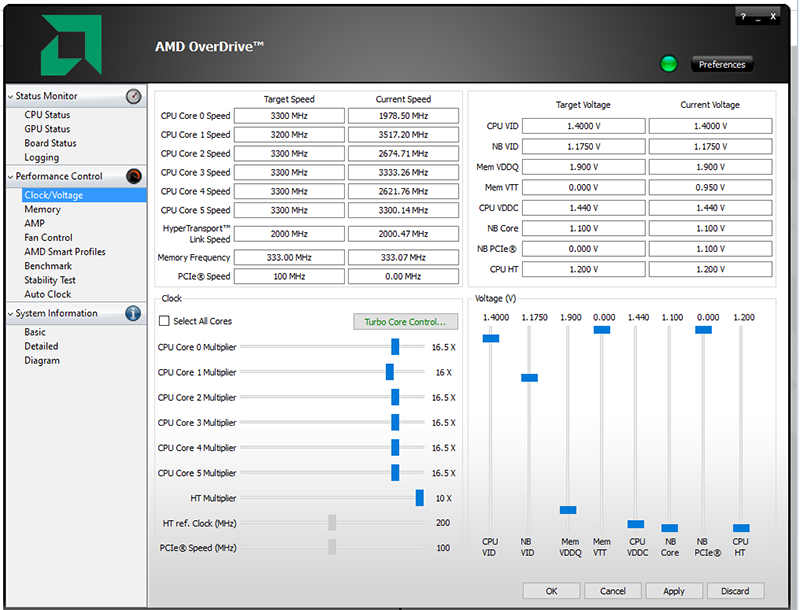 Интерфейс программы интуитивно понятен и разделён на несколько вкладок, каждая из которых отвечает за определённый аспект настройки. Вкладка Status Monitor отображает текущее состояние системы: загрузку процессора, температуры, рабочие частоты и напряжения. Это позволяет отслеживать изменения в режиме реального времени и быстро реагировать на перегрев или нестабильность. Меню Performance Control предоставляет ползунки для изменения множителя ЦП, частоты HyperTransport и напряжения, что позволяет гибко настраивать разгон.