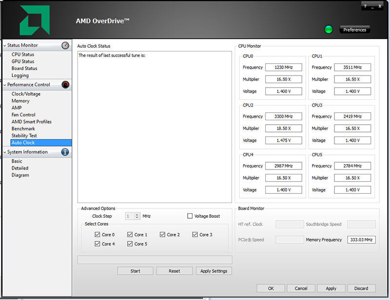 Одним из главных преимуществ AMD Overdrive является официальная поддержка со стороны производителя, что обеспечивает совместимость и относительную безопасность при правильном использовании. Программа позволяет как ручную, так и автоматическую настройку разгона, включая функцию Auto Clock, которая постепенно увеличивает частоту и проверяет стабильность. Также встроен тест производительности помогает проверить, насколько стабильно система работает после внесённых изменений. Вкладка Memory даёт возможность настроить тайминги и частоту оперативной памяти для ускорения обработки данных.
