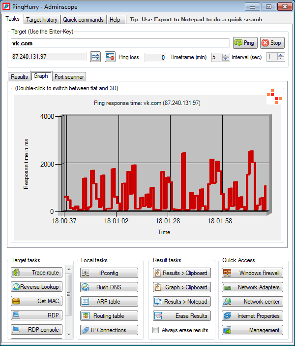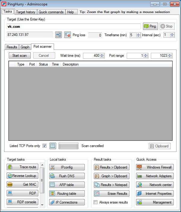 Использование утилиты не требует глубоких технических знаний. Для проверки доступности сайта достаточно ввести его адрес в соответствующее поле и нажать кнопку «Ping». Результаты отображаются в реальном времени, а пользователь может выбрать формат вывода: консольный или графический. Графический режим позволяет визуально оценить стабильность соединения по задержкам. Данные можно сохранить локально или скопировать в буфер для дальнейшего анализа. Сканирование портов активируется отдельной командой, где указывается целевой IP-адрес и диапазон портов. Программа также предоставляет кнопки для вызова системных окон: диспетчера устройств, настроек сети, опций брандмауэра и других компонентов Windows. Доступ к MAC-адресу и информации о DNS-конфигурации реализован через отдельные функции, что упрощает диагностику сетевых проблем.
