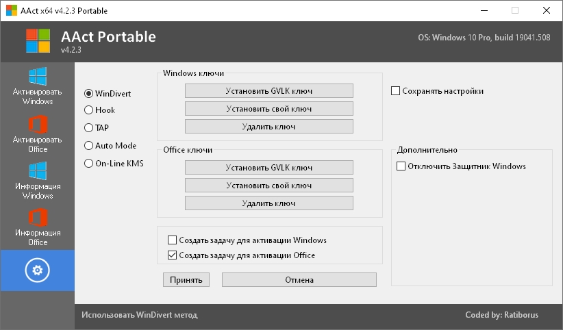 AAct 4.3.3 x64 — портативный активатор от разработчика Ratiborus, предназначенный для активации операционных систем Windows и пакетов Microsoft Office. Утилита поддерживает версии Windows от 7 до 11 и Office с 2010 по 2016 год, работает без установки и не требует .NET Framework. Программа доступна на русском языке и предлагает простой интерфейс для быстрой активации через KMS-метод.