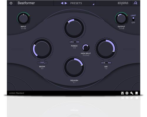 Accusonus Beatformer — это мощный звуковой плагин, предназначенный для точной обработки ударных и басовых элементов в реальном времени. Программное обеспечение предлагает интуитивно понятный подход к шейпингу звука с помощью четырёх основных режимов: Boom, Punch, Squash и Air. Плагин совместим с популярными форматами VST и AAX Native, что делает его универсальным решением для работы в различных цифровых аудиостанциях.
