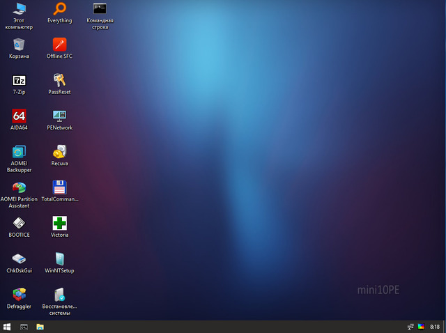 Использование mini10PE не требует специальной подготовки. Достаточно записать образ на загрузочную флешку с помощью Rufus или аналогичной утилиты и запустить компьютер с неё. Интерфейс полностью на русском языке, все программы организованы в удобное меню. Главное рабочее окружение напоминает классический Windows, что упрощает навигацию. Пользователь может запускать утилиты из папки на рабочем столе, работать с дисками, анализировать состояние оборудования или восстанавливать систему. В состав mini10PE также включены инструменты для сброса паролей Windows, такие как NTPWEdit и PassReset, что удобно при утере доступа. Редактор разделов AOMEI Partition Assistant и Macrorit Partition Expert позволяют изменять размер, создавать, удалять или форматировать диски без потери данных.