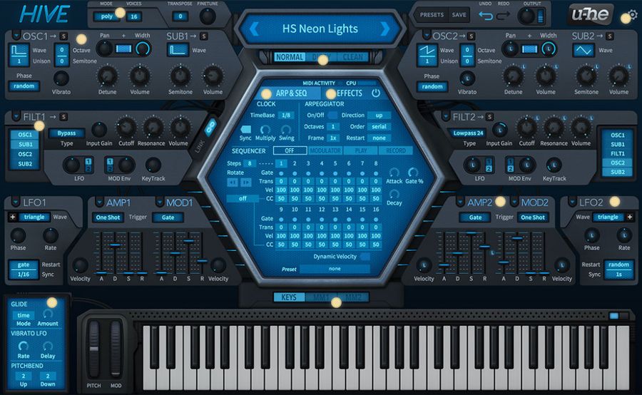 Синтезатор u-he Hive построен вокруг двух основных осцилляторов, каждый из которых может работать в монофоническом, полифоническом, дуэтном или легато-режиме, поддерживая до 16 голосов в унисоне. Такая гибкость позволяет создавать плотные пэды, резкие басы и выразительные мелодические линии с минимальными усилиями. Архитектура включает вспомогательные генераторы, что расширяет спектр генерируемых звуков и делает возможным сложный сайд-чейнинг и модуляции на низком уровне. Интерфейс остаётся читаемым и логичным, несмотря на большое количество параметров, благодаря продуманной цветовой схеме и компоновке элементов.