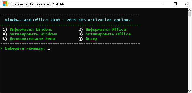ConsoleAct разработана известным создателем системных утилит Ratiborus, который уже давно зарекомендовал себя как надёжный разработчик, упрощающий жизнь пользователям. Эта программа объединяет в себе минимализм интерфейса и высокую эффективность — всё, что нужно, находится в понятном текстовом меню на русском языке. Для запуска не требуется установка, благодаря своему portable-формату утилита работает сразу после запуска с любого носителя. ConsoleAct поддерживает активацию как Windows, так и Microsoft Office 2010, 2013, 2016 и 2019 годов, обеспечивая полный доступ к функционалу без ограничений.