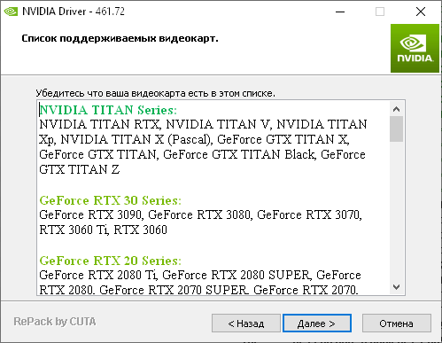 Nvidia DriverPack — это неофициальный репак, созданный энтузиастом CUTA, объединяющий драйверы для всех актуальных видеокарт компании NVIDIA. Сборка включает поддержку десктопных и мобильных GPU, что делает её универсальным решением для различных конфигураций. Версия 461.72 основана на официальном выпуске от производителя, но модифицирована для более гибкой установки и минимизации лишних компонентов.