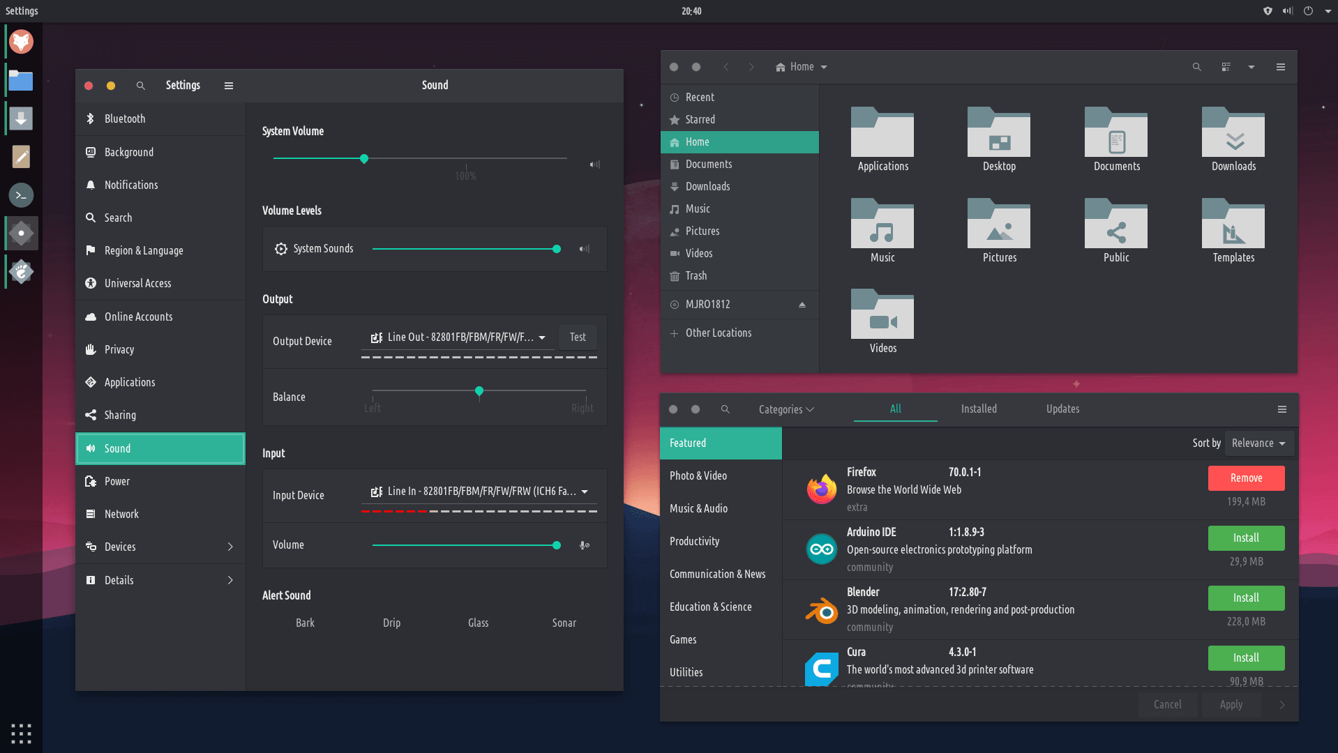 - Система использует Gnome в качестве основного окружения, глубоко кастомизированного под стиль проекта