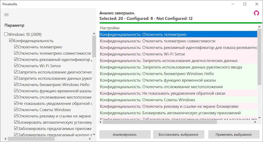 Запуск Privatezilla не требует прав администратора, хотя для внесения изменений в систему необходимо подтвердить действия через UAC. После открытия приложения пользователь видит главный интерфейс с полным списком параметров конфиденциальности, разделённых по категориям на боковой панели. Нажав кнопку «Анализировать», программа проверяет текущее состояние всех настроек и отображает их статус — включено или отключено. Далее пользователь может выбрать нужные пункты, включить или выключить их, а затем применить изменения кнопкой «Применить». После завершения процесса можно провести повторное сканирование, чтобы убедиться в корректности изменений. Такой подход делает работу с системными настройками простой и понятной даже для новичков.