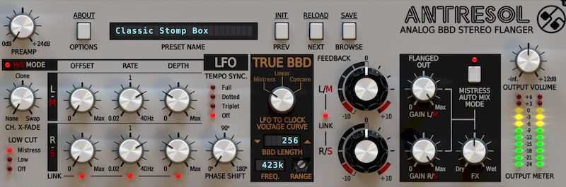 Одна из главных особенностей Antresol — высокая достоверность аналогового моделирования. Использованы три разных кривых синхронизации LFO-to-BBD, что позволяет экспериментировать с формой модуляции. Благодаря встроенной поддержке тегов, навигация по предустановкам становится быстрой и интуитивной. Пользователь может быстро найти нужный тембр для гитары, баса, клавишных или вокала.