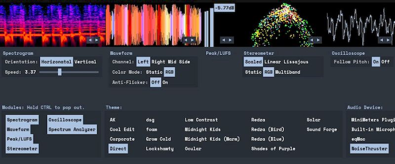 MiniMeters — это программное обеспечение, ориентированное на точный контроль и визуализацию аудиосигнала. Программа разрабатывалась с учётом потребностей профессиональных пользователей, работающих с записью, сведением и мастерингом звука. Основная функция — это отображение аудиоданных в режиме реального времени с помощью специализированных модулей. Каждый из них отвечает за определённый тип анализа: например, модуль спектрограммы показывает распределение частот по времени, а осциллограф позволяет увидеть форму волны сигнала. Все модули работают одновременно и могут быть настроены индивидуально, что повышает удобство при работе с разными аудиоисточниками.