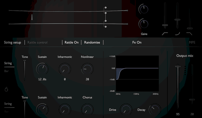 - Поддерживается игра восемью голосами, каждый из которых независимо моделирует струну и механическое воздействие на неё.
