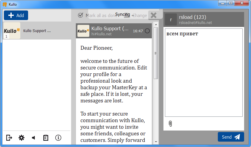 - Каждое сообщение в Kullo шифруется до момента доставки, что гарантирует, что переписка остаётся приватной даже при использовании публичных сетей.
