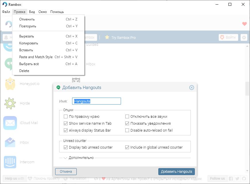 Работа с Rambox
