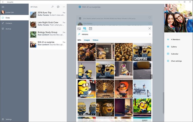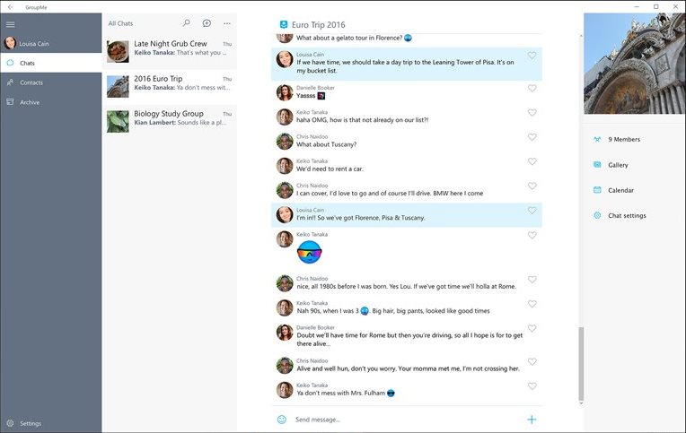 Использование GroupMe начинается с установки приложения из магазина Microsoft, после чего пользователь может авторизоваться с помощью учётной записи. После входа в систему отображается список контактов, с которыми можно мгновенно создать новую беседу, выбрав нужные имена. Каждый чат поддерживает текстовые сообщения, упоминания участников, отправку файлов и медиа, а также функцию напоминаний, которая особенно полезна при организации встреч или совместных задач. Интерфейс приложения адаптирован под работу на ПК, с крупными кнопками и чёткой навигацией. Все активные и архивные беседы отображаются в боковой панели, а новые сообщения сопровождаются уведомлениями, которые можно настроить в параметрах. GroupMe не требует сложной настройки — приложение готово к использованию сразу после запуска.