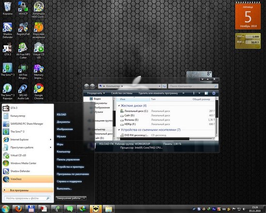 - Тема включает полную замену курсоров, значков папок, звуков системы и элементов оформления интерфейса