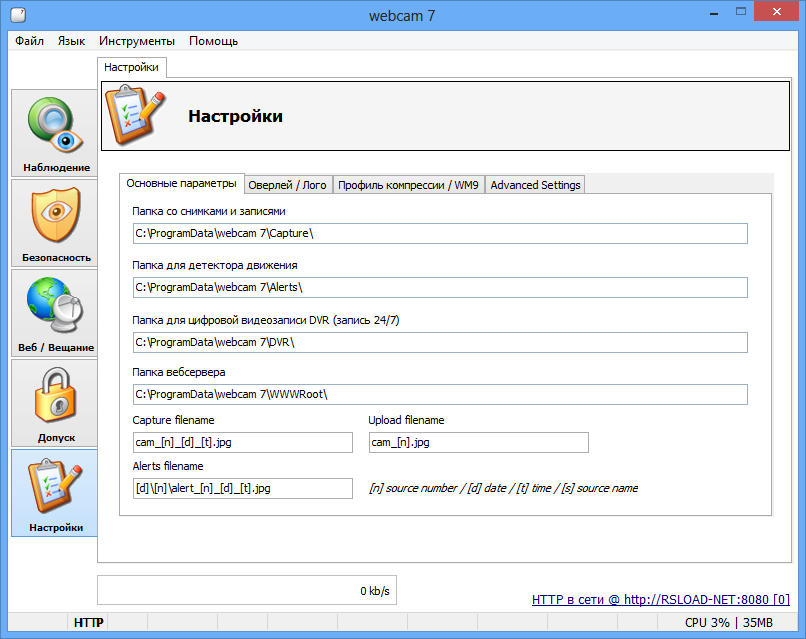 - Настройка видеопотока с возможностью масштабирования, смены разрешения и частоты кадров