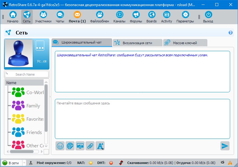 RetroShare представляет собой децентрализованную сеть для обмена файлами, сообщениями и электронной почтой между пользователями, которые установили доверие друг к другу через обмен криптографическими сертификатами. В отличие от традиционных P2P-платформ, здесь нет общедоступных индексов или публичных серверов — всё взаимодействие происходит в рамках замкнутой сети доверенных узлов. Программа поддерживает шифрование всех каналов связи, что делает прослушивание и перехват данных практически невозможным. При этом RetroShare предлагает ряд дополнительных функций, таких как чат, форумы, голосовое общение и встроенная почтовая система.