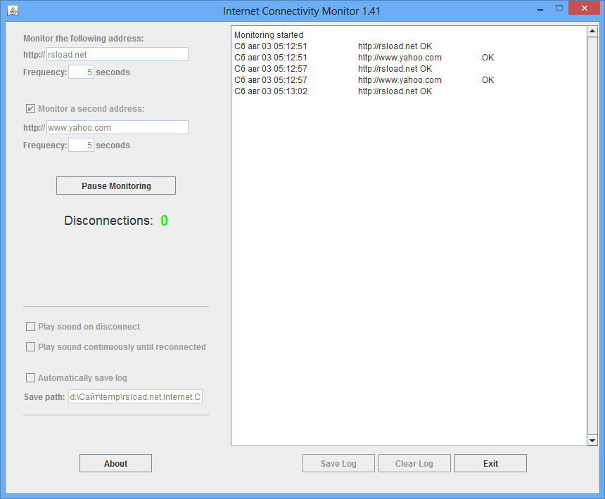 Internet Connectivity Monitor 1.41 — компактная утилита для постоянного контроля состояния интернет-соединения, оповещающая пользователя при его обрыве. Программа не требует установки, работает в фоне и быстро реагирует на изменения в доступе к сети. Поддерживает мониторинг сразу нескольких веб-адресов для повышения точности проверки соединения.