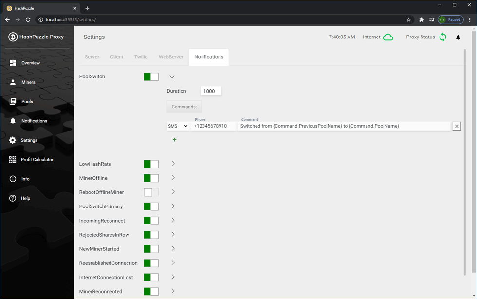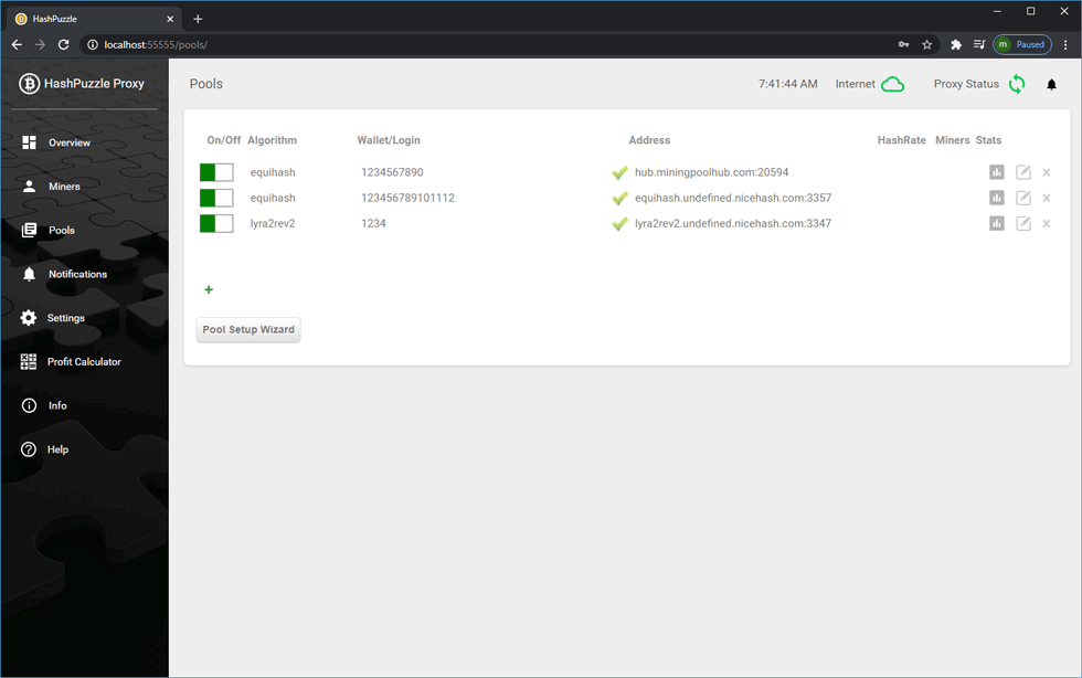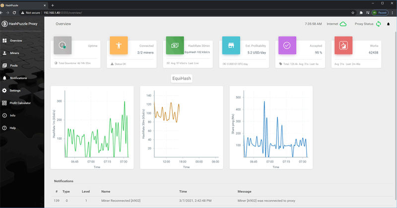 Для начала работы достаточно установить программу на компьютер с операционной системой Windows 7 или выше и запустить её. После запуска HashPuzzle Proxy становится доступен через локальный IP-адрес в браузере, где открывается веб-интерфейс с панелью управления. Майнеры настраиваются на подключение к локальному IP и порту прокси, после чего центральное приложение начинает сбор данных. Через интерфейс можно назначать активные пулы, настраивать приоритеты, устанавливать пороги для уведомлений и просматривать калькулятор прибыли в реальном времени. Работа с несколькими майнинговыми устройствами не требует изменения конфигурации каждого из них при смене пула — все операции выполняются из одного окна.