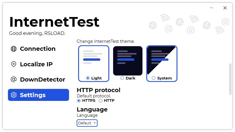 Пользоваться InternetTest несложно: после запуска программа автоматически начинает проверку соединения, используя сайт по умолчанию. Пользователь может изменить адрес для тестирования в настройках, указав любой доступный ресурс. Интервал проверок также настраивается, что позволяет адаптировать частоту опроса под конкретные нужды. Во время работы отображается статус подключения, IP-адрес и примерное местоположение, что делает InternetTest удобным для диагностики сетевых проблем.