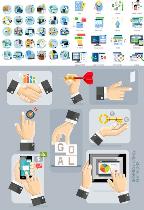 - Коллекция включает универсальные символы, ассоциирующиеся с деловой активностью, такими как график роста, рукопожатие, документы и стрелки прогресса
