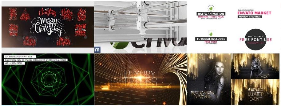 - Elegant Luxury Titles и Luxury Event ориентированы на премиум-сегмент, включая свадебные фильмы, торжественные мероприятия, люксовые презентации. Дизайн отличается изысканностью, плавностью переходов и использованием дорогостоящих визуальных элементов, таких как золотые эффекты и бриллиантовые блики.