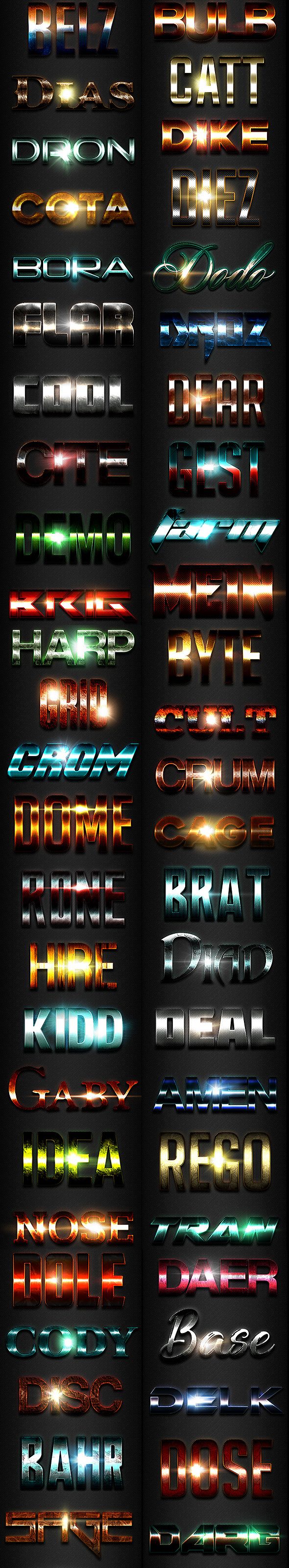 Пакет текстовых эффектов разработан для пользователей, которым необходимо быстро придать тексту профессиональный вид без необходимости создавать стили с нуля. Набор включает в себя 50 уникальных вариантов, имитирующих объем, отражения, материалы вроде металла, стекла, дерева и других поверхностей, а также световые и теневые эффекты. Все файлы выполнены в формате Layered PSD и дополнены стилями Photoshop ASL, что позволяет легко применять их в любом проекте.