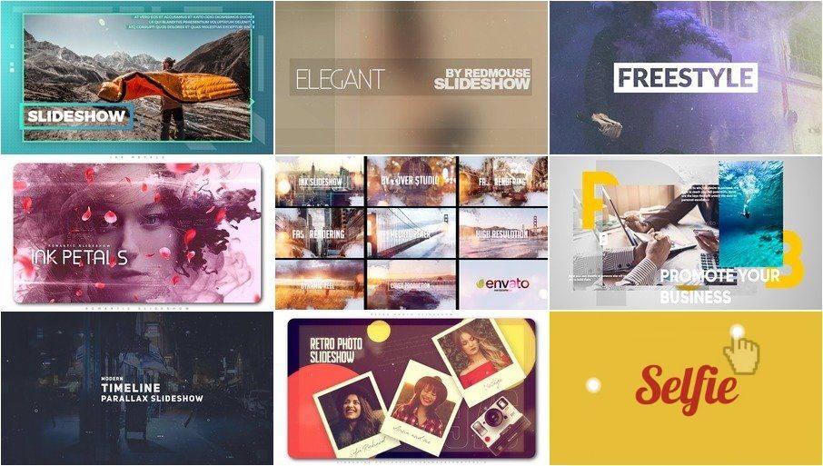 Преимуществом этого набора является его тематическое разнообразие и высокое качество анимаций. Шаблоны интуитивно понятны даже для новичков, а наличие таких вариантов, как Selfie – Template For Your Slideshow, позволяет использовать их для личных видеоблогов. Parallax Timeline Slideshow отличается многоуровневой анимацией, создающей эффект глубины, а Freestyle Slideshow дает свободу в компоновке кадров.