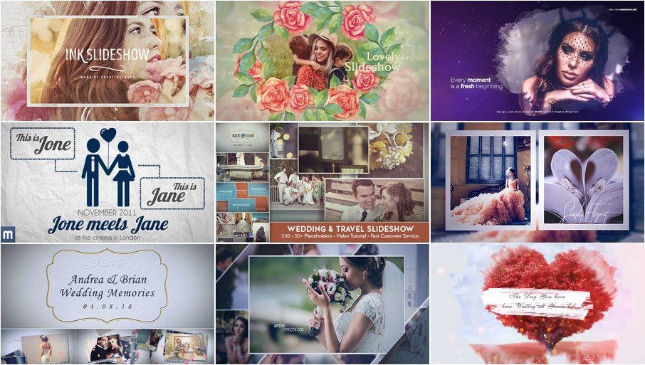 Сборка включает девять уникальных проектов, разработанных на основе популярных шаблонов с платформы VideoHive. Каждый шаблон обладает продуманной анимацией, чистой графикой и возможностью простой настройки текста, изображений и цветовой палитры. Такие заготовки, как Ink Slideshow – Romantic Memories и Romantic Slideshow – Stars, позволяют создавать видео с атмосферой нежности и душевной близости. Проекты вроде Wedding & Travel Slideshow расширяют функционал, комбинируя тематику свадьбы и путешествий, что добавляет универсальности комплекту.