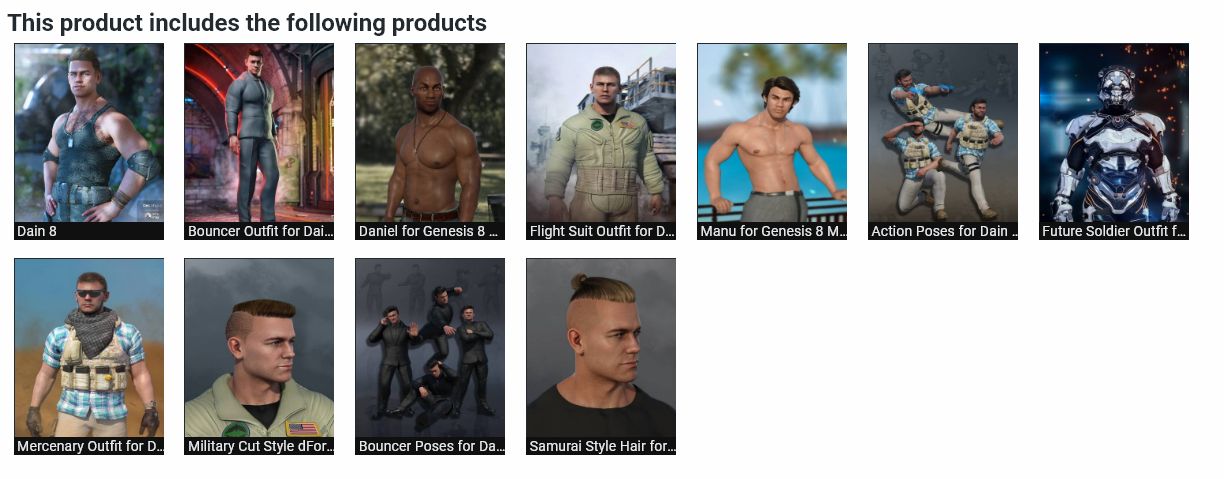 Dain 8 Pro Bundle представляет собой профессиональный цифровой контент, созданный компанией Daz Productions, Inc для использования в DAZ Studio 4.12 и выше. Программное обеспечение позволяет работать с высококачественными 3D-персонажами, настраивать их внешний вид и встраивать в сложные сцены. Пакет ориентирован на пользователей, которым важны точность анатомии, динамика поз и качество текстур.