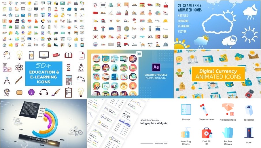 Комплект из 9 проектов от VideoHive для After Effects — это подборка из качественных анимированных шаблонов, включающая иконки, инфографику и визуальные элементы для цифрового маркетинга, образования и других сфер. Все проекты адаптированы под среду After Effects CC 2020 и подходят для создания динамичных презентаций, слайд-шоу, логотипов и других видеорешений. Сборка подходит как фрилансерам, так и студиям, стремящимся ускорить процесс разработки визуального контента.